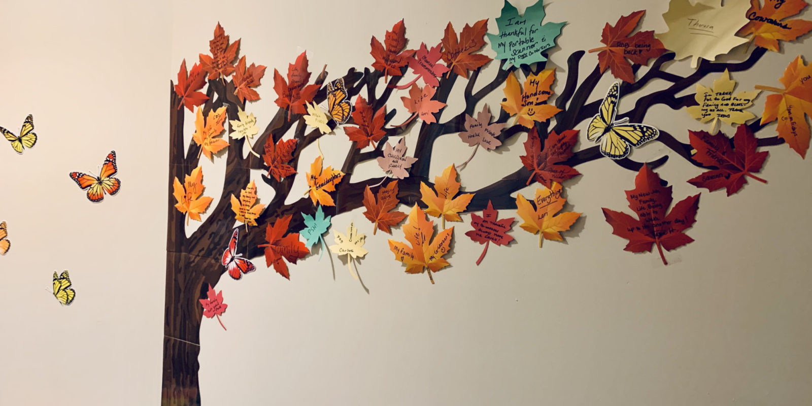 In the back hallway of our main building at 160 Broad St, we have a picture of a large tree hanging on the wall. Next to the tree, there is a table with tape, a pen and colorful leave cut-outs. The setup is available for any shelter guest, student, employee, or resident of the building who wants to write on the leaf what they’re thankful for and then hang it on the tree.